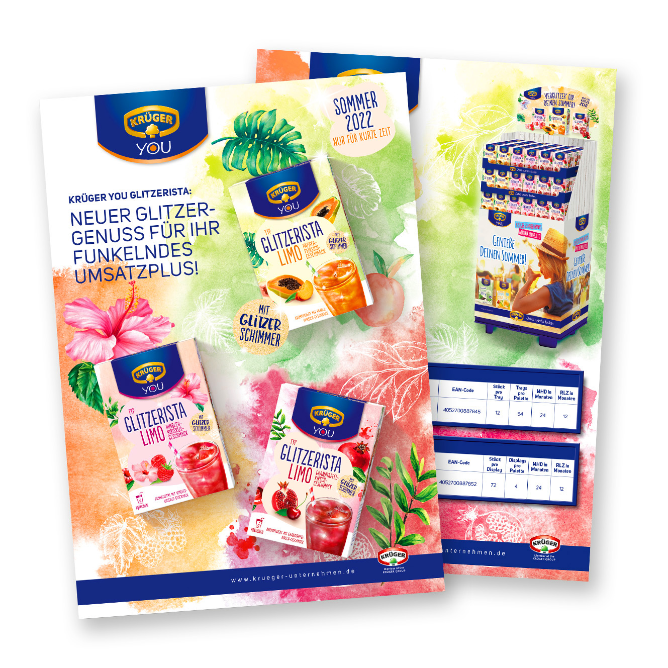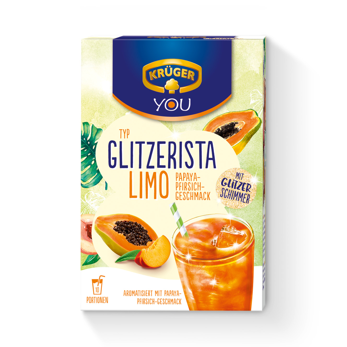 Die brandneue KRÜGER YOU GLITZERISTA LIMO schenkt einen schimmernden Sommermoment für zuhause. Die besonderen Glitzerista-Momente gibt es mit Himbeer-Hibiskus, Papaya-Pfirsich oder Granatapfel-Kirsch. Packaging Design mit noch mehr appetite appeal zur Darstellung der glitzernden USPs.